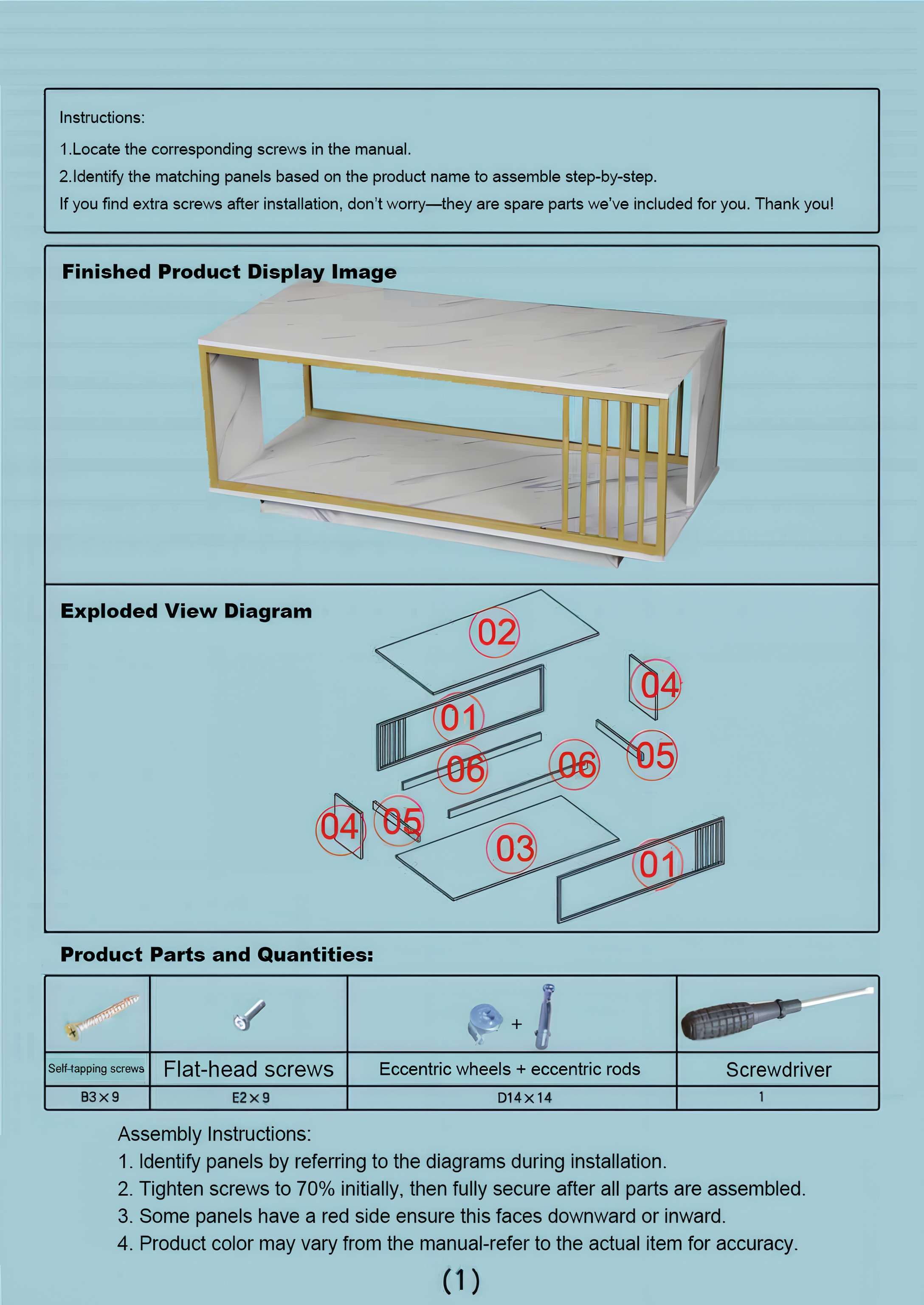 - Do not overtighten screws at the beginning. First align all panels, then fully tighten.