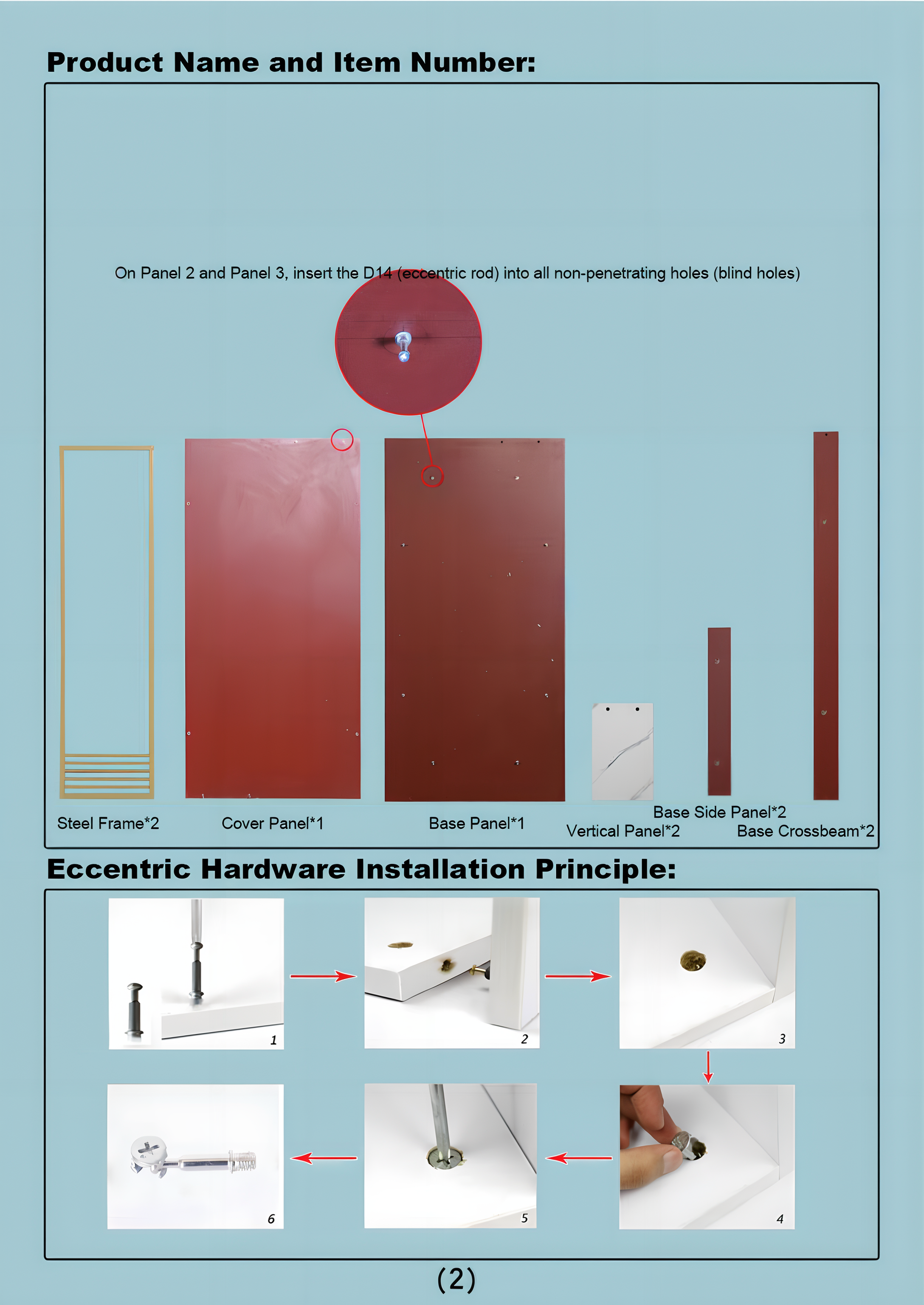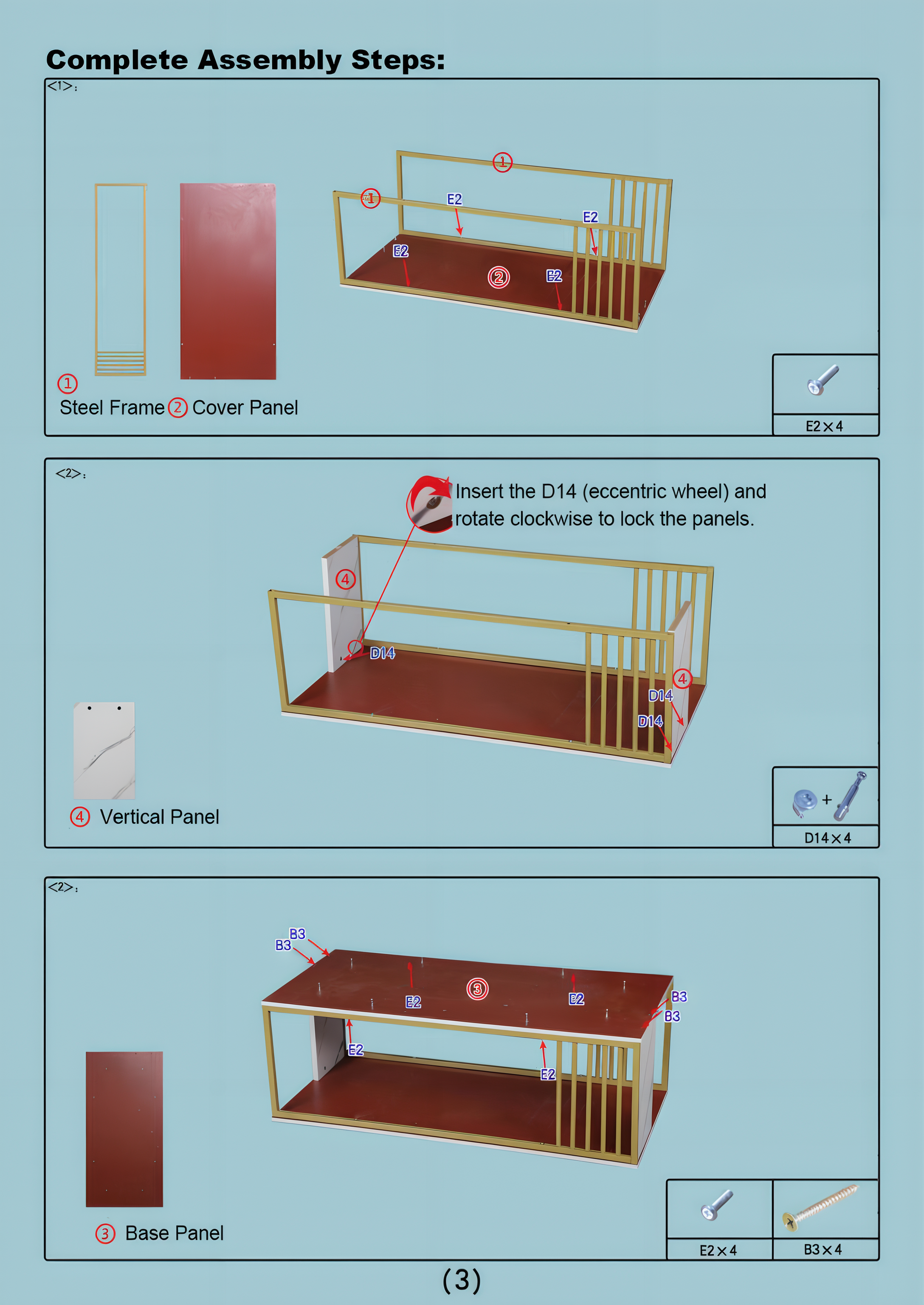 Insert D14 eccentric rods into the pre-drilled blind holes of the steel frames and panels. Attach the 2 ร Vertical Panels (04) on both ends using 4 ร D14 sets. Rotate the eccentric wheels clockwise to lock.