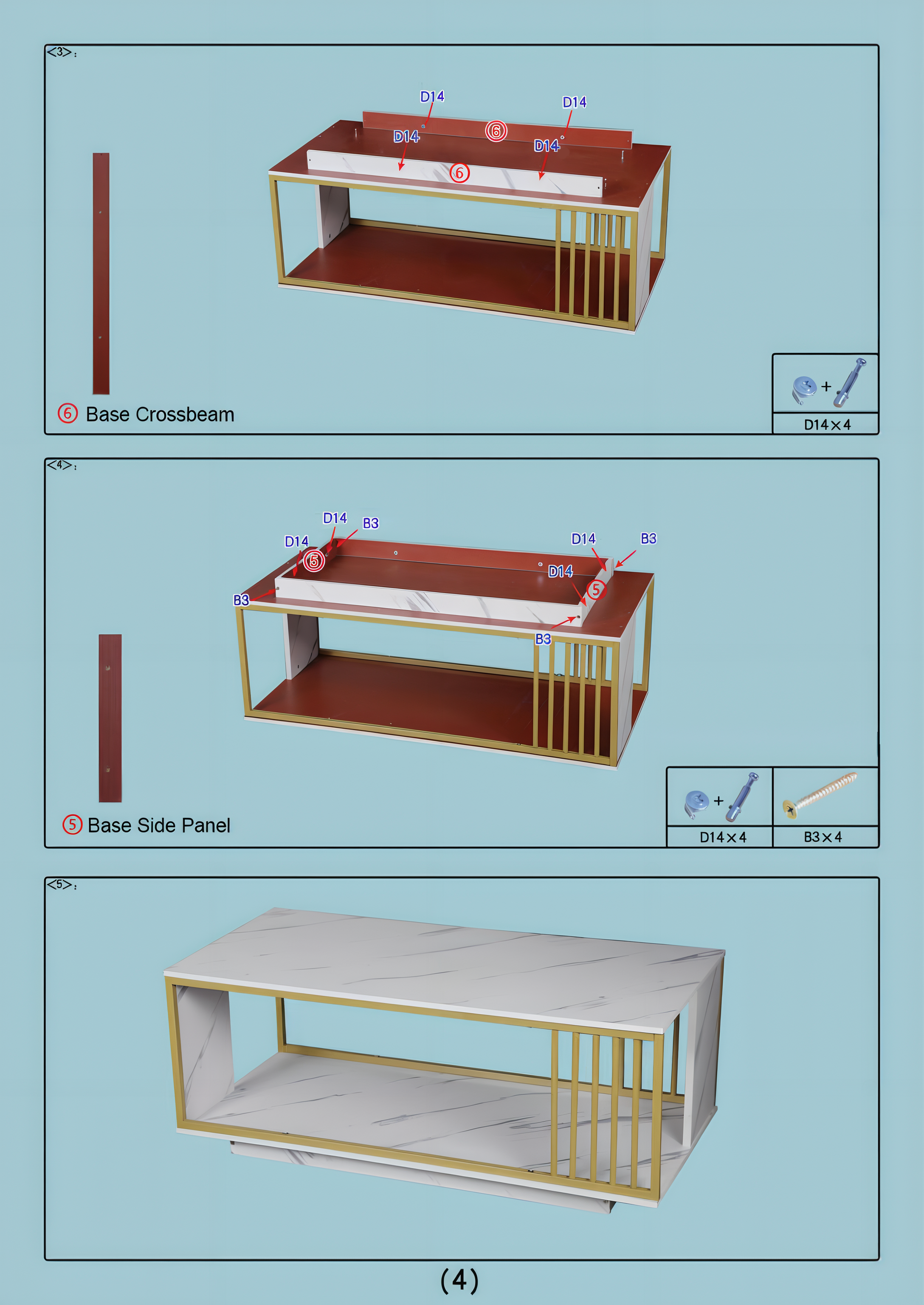 Mount 2 ร Side Panels (05) to the crossbeams and lock with another 4 ร D14 and 4 ร B3 screws.